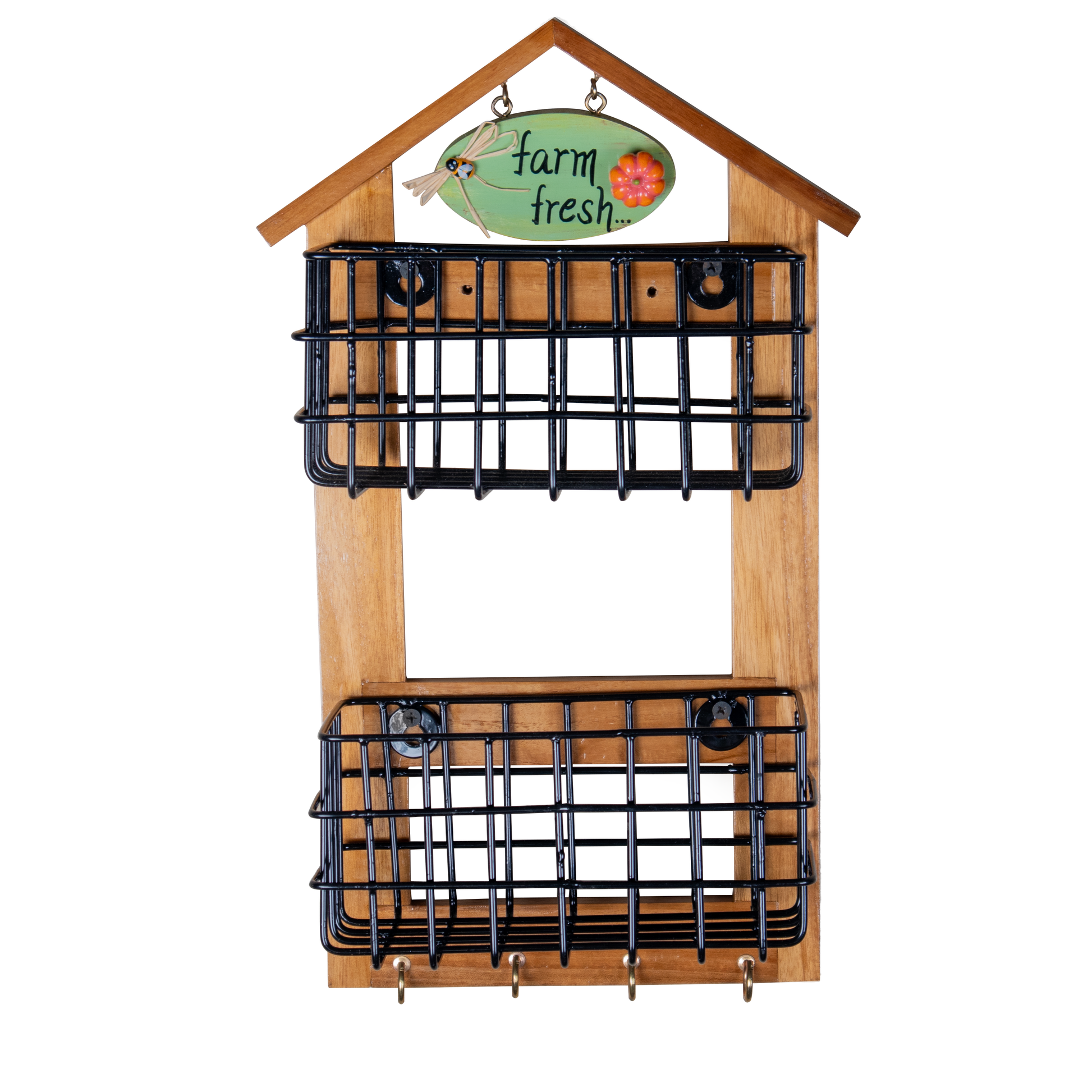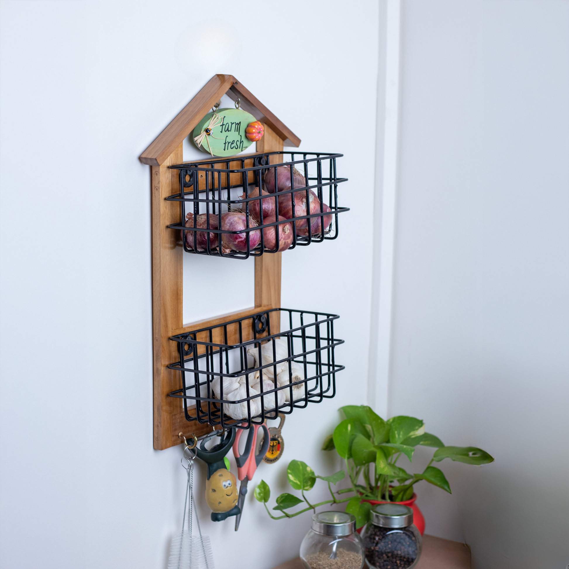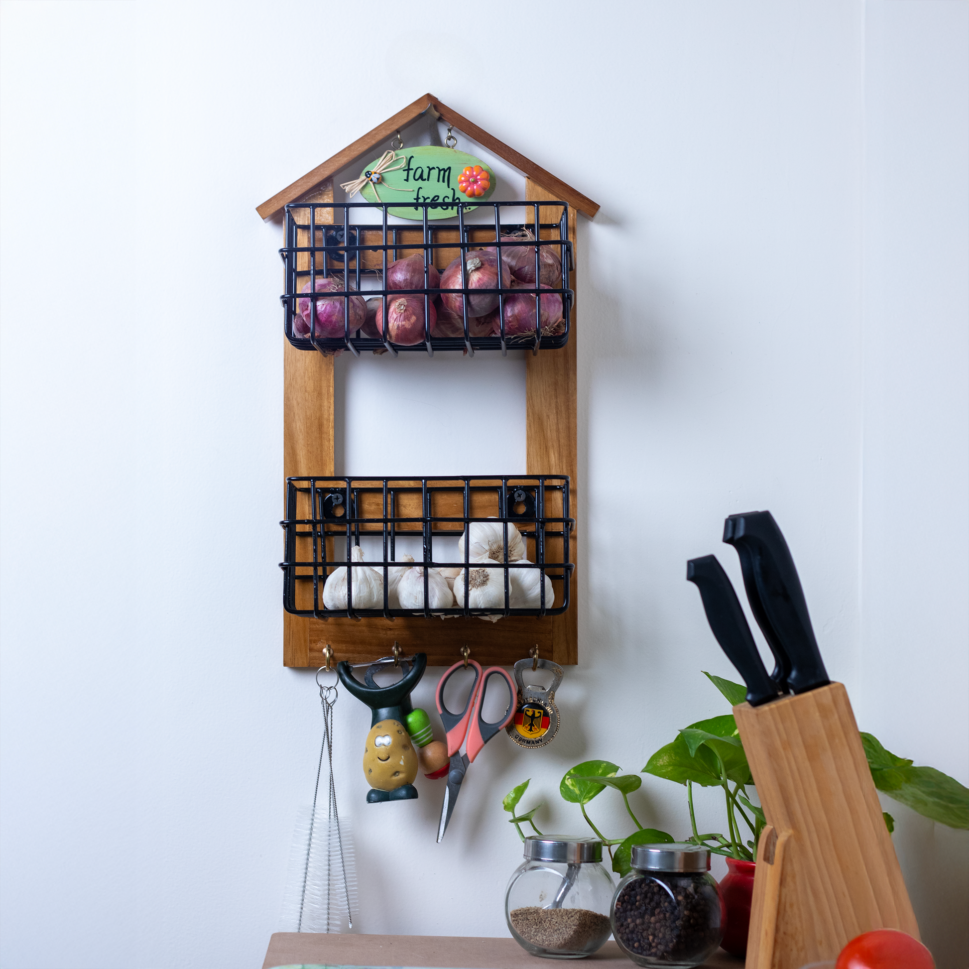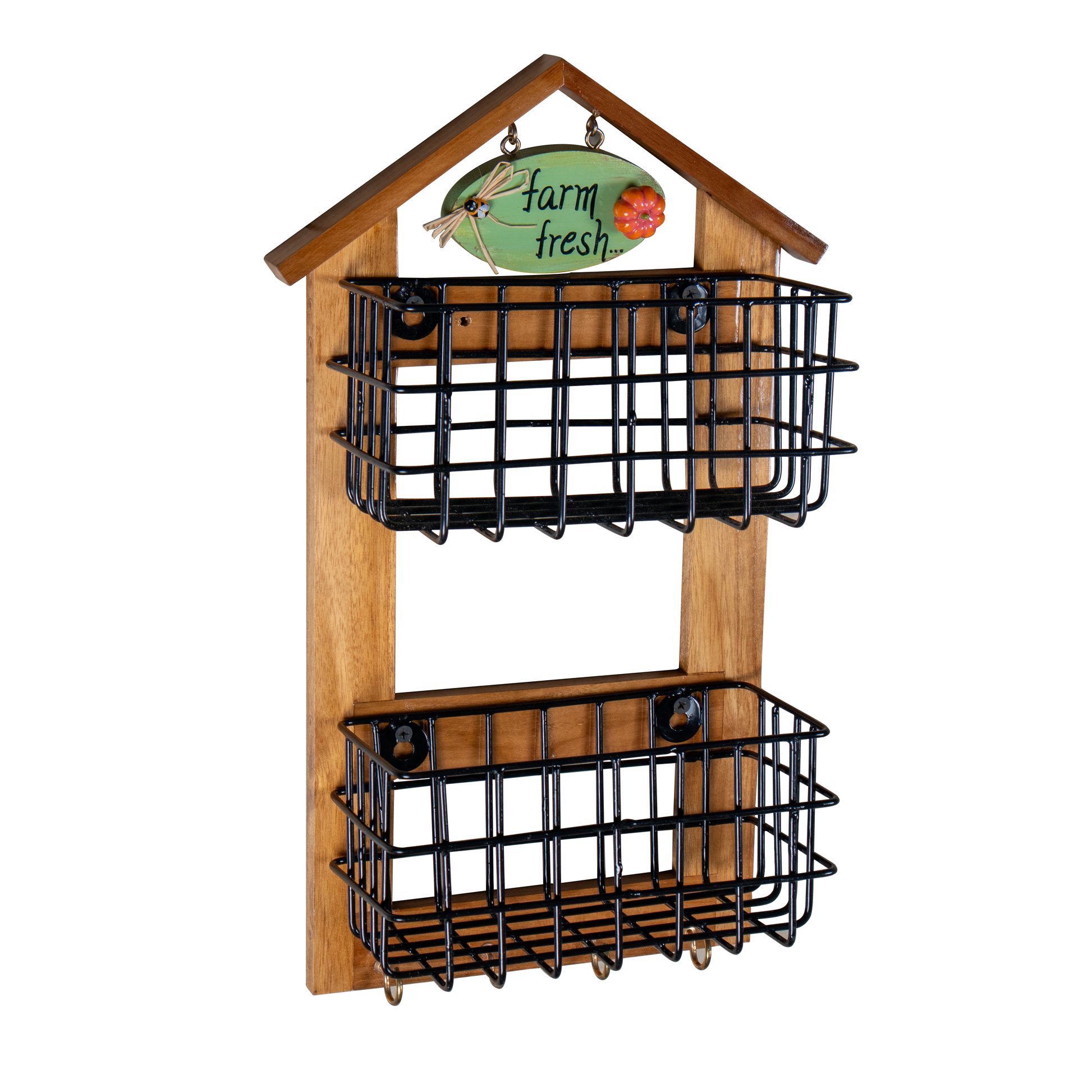 Brand: The Weaver's Nest™ Features: - AESTHETICALLY DESIGNED: This Rustic-style wall-mounted vegetable storage unit features two metal wire baskets, ideal for organizing and displaying produce like onions, potatoes, and garlic. The Wooden Frame backing and "farm fresh" sign emphasize a farmhouse or country kitchen aesthetic. It combines a natural wood base with black wire baskets, offering a blend of rustic and industrial styles.