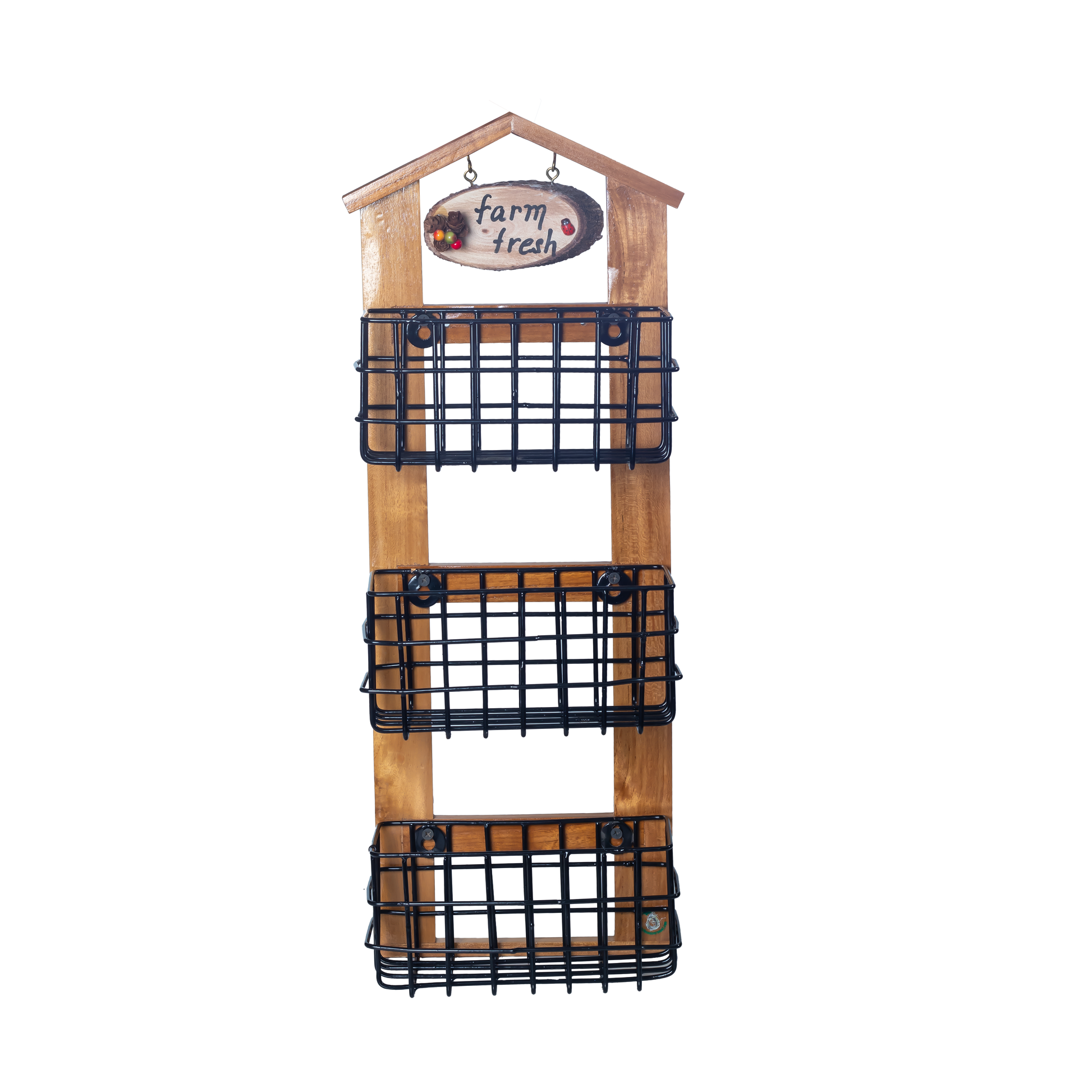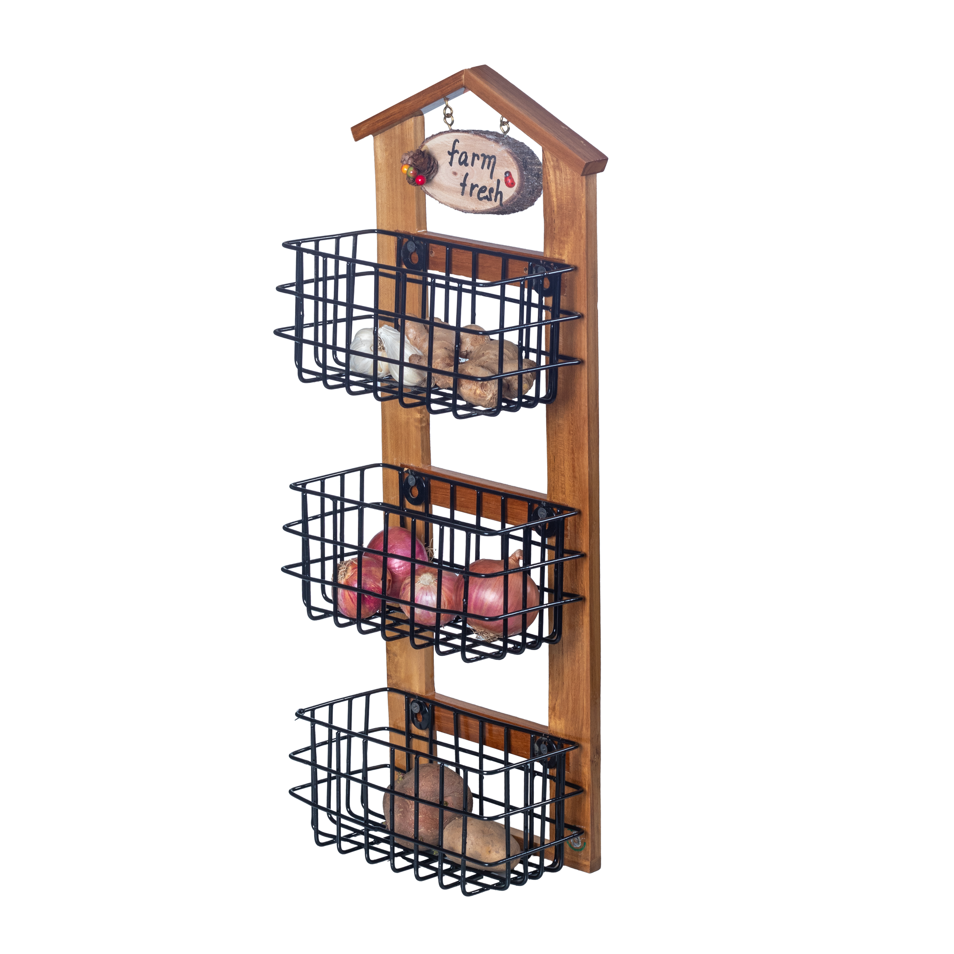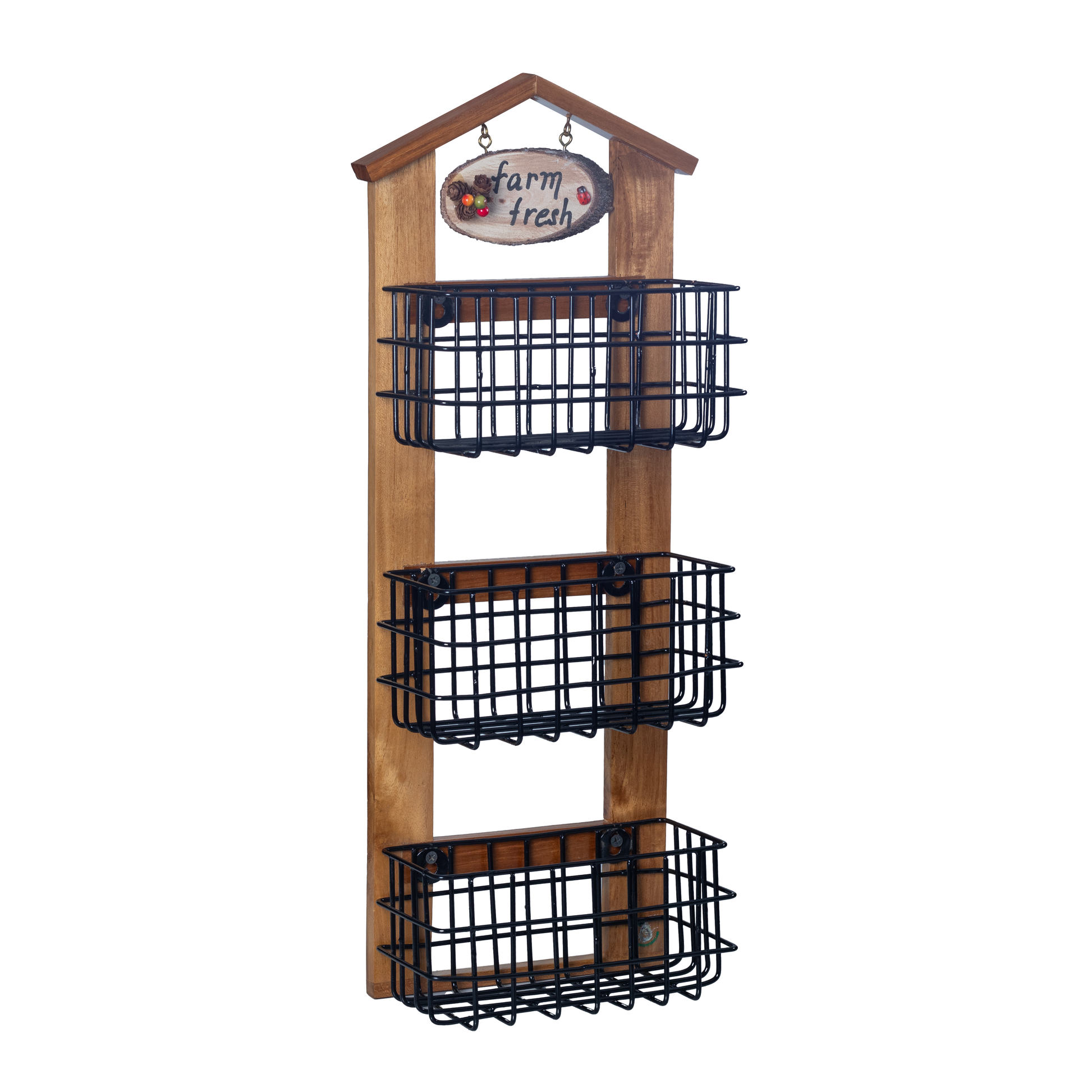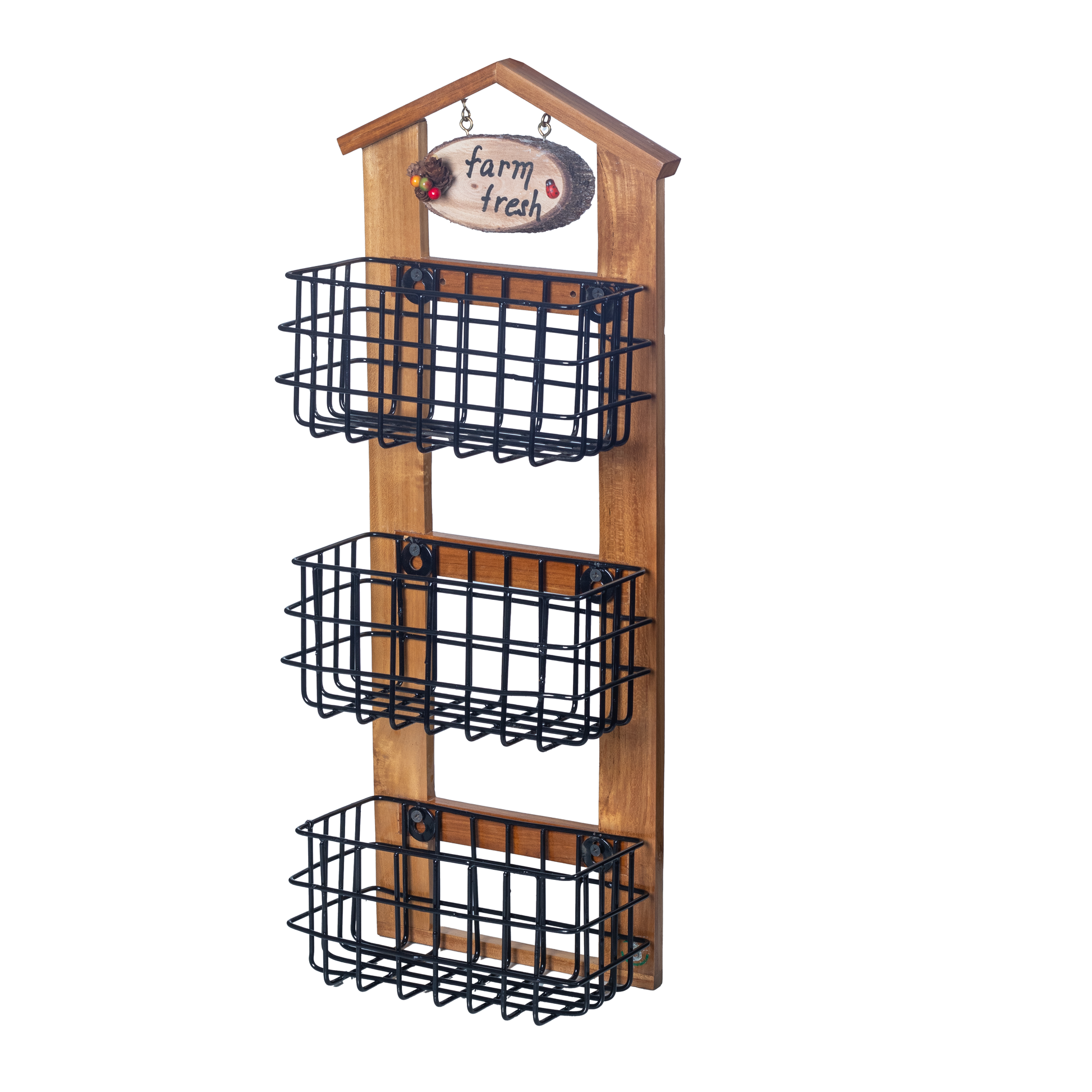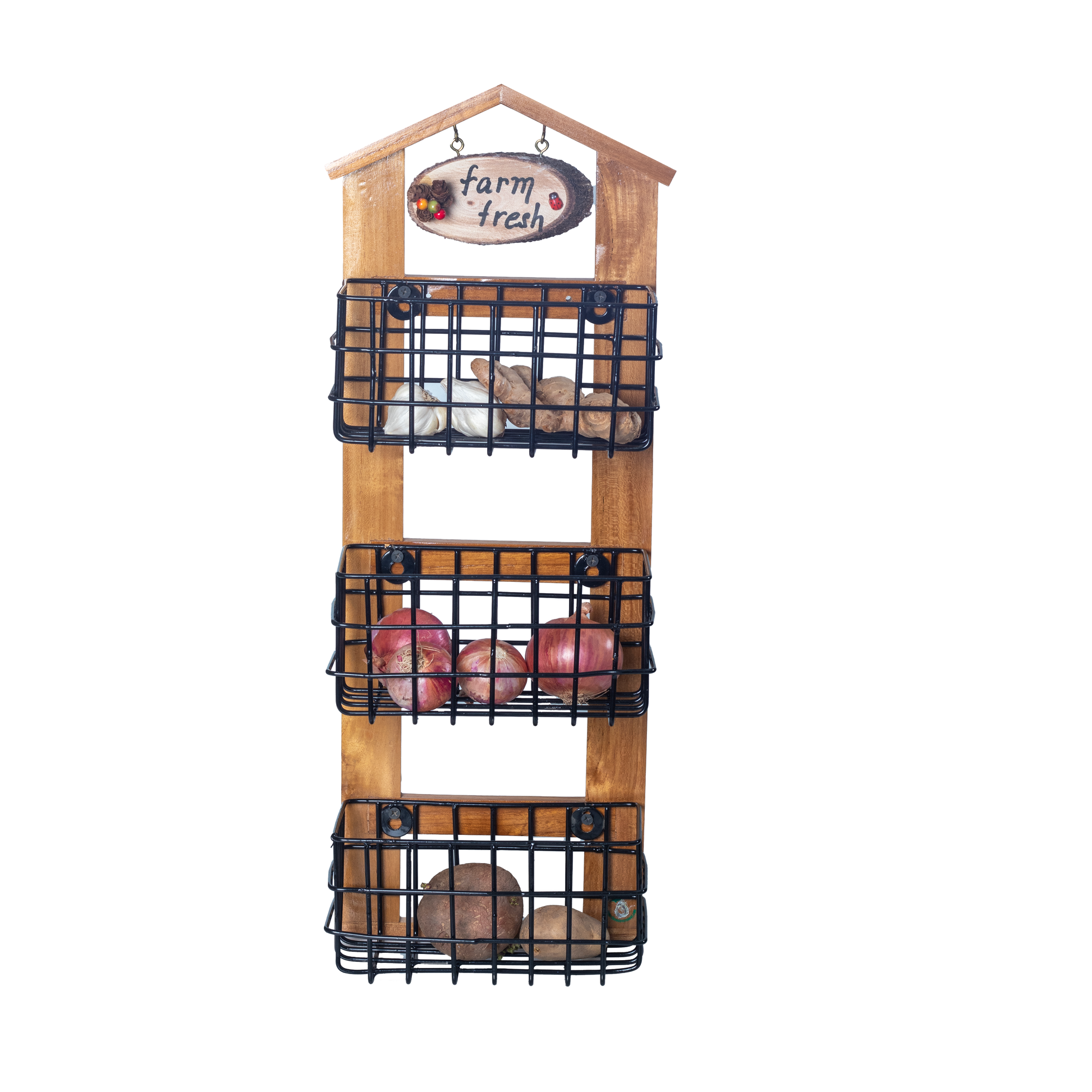 Brand: The Weaver's Nest™ Features: - AESTHETICALLY DESIGNED: This Rustic-style wall-mounted vegetable storage unit features three metal wire baskets, ideal for organizing and displaying produce like onions, potatoes, and garlic. The Wooden Frame backing and "farm fresh" sign emphasize a farmhouse or country kitchen aesthetic. It combines a natural wood base with black wire baskets, offering a blend of rustic and industrial styles.