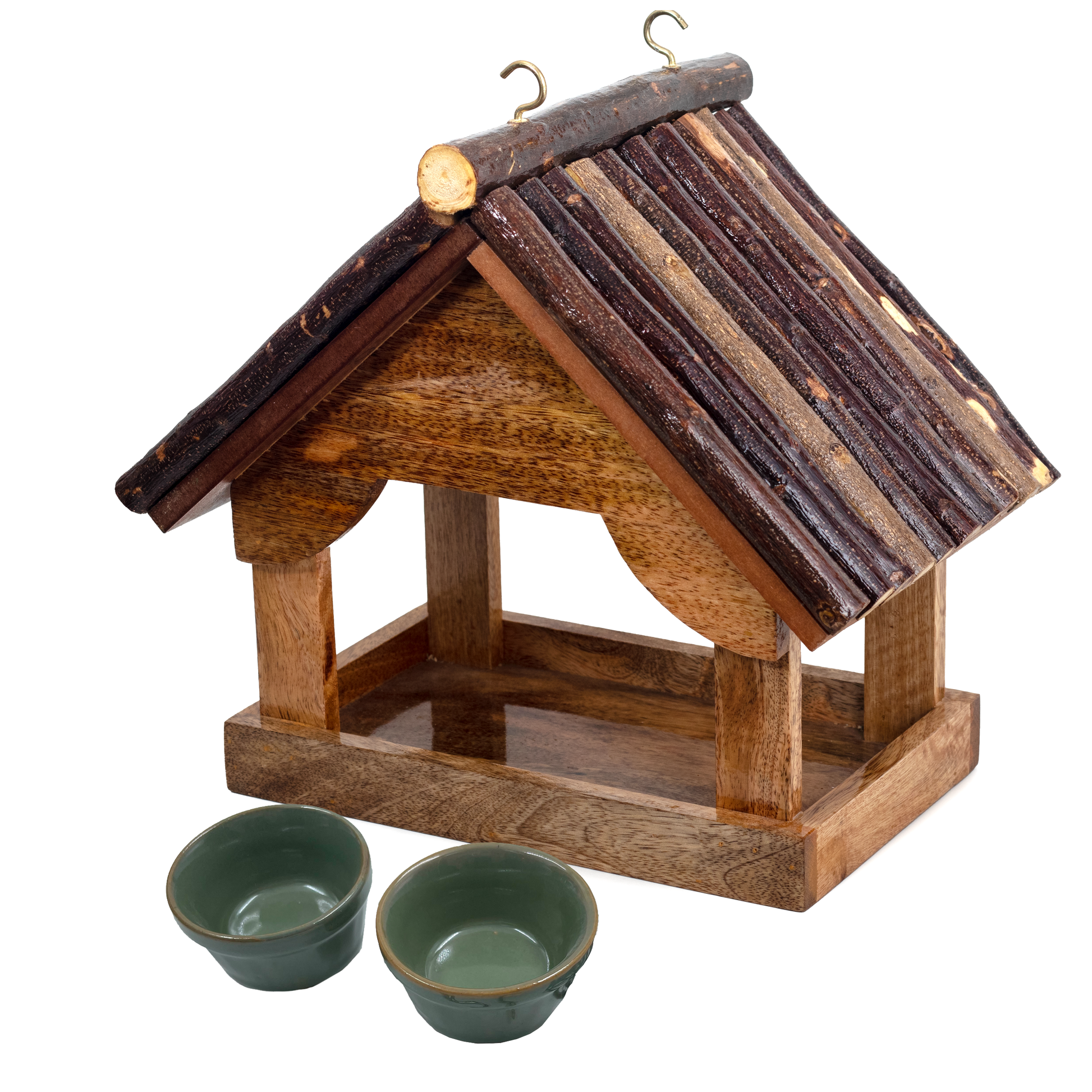 - MATERIAL: The birdfeeder is made from solid wood, with a pitched roof made of dark, bark-covered wood branches, giving it a natural, rustic appeal. It comes with a water-resistant melamine coating, giving it a smooth and shiny finish. This product would look beautiful for years.
